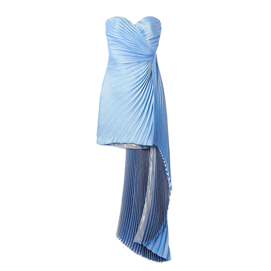From the lustrous finish to the dramatic silhouette, every detail of our mini dress is meant to be admired. It's cut from pleated silk-blend crepe that's flecked with metallic shimmer and has a strapless wrap-effect bodice and sweeping draped panel that floats behind you with each step. Accessorize with sleek point-toe pumps and a pink lip.