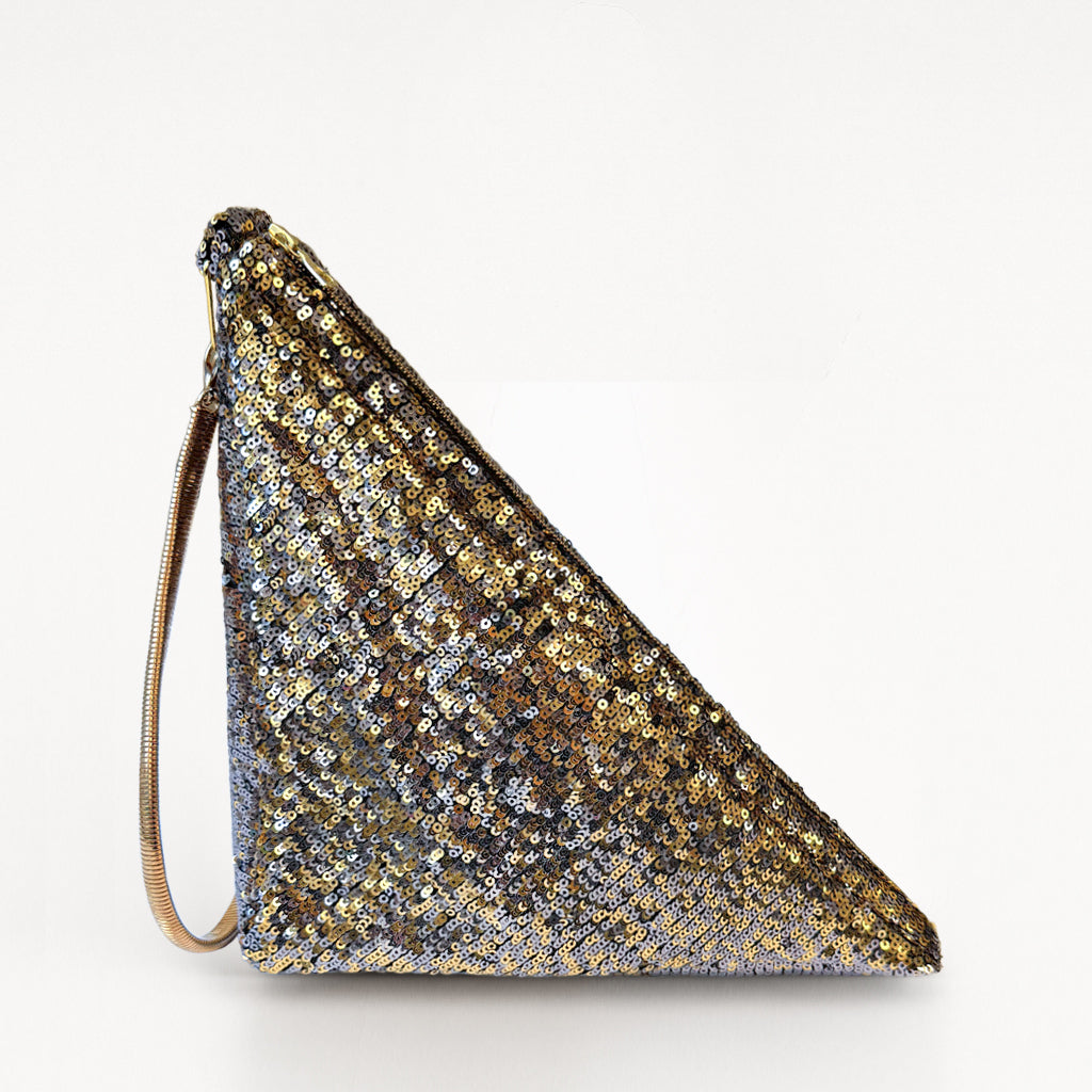 Designed in a sculptural pyramid silhouette, this clutch transitions seamlessly from gold to silver ombré sequins for a radiant, multidimensional shine. Finished with a gleaming gold metal zipper and a sleek metal wrist strap, it’s as practical as it is glamorous.