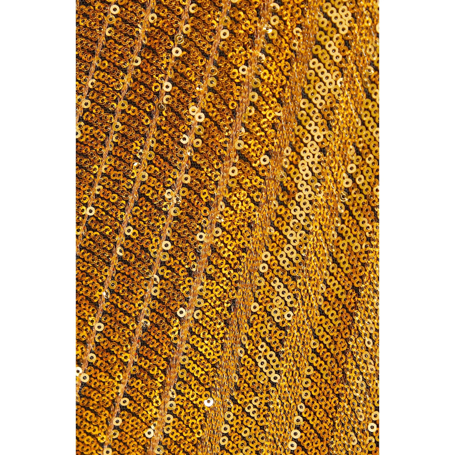 A study in radiance, this gown is cut from gold sequined fabric using a couture pleating technique that sculpts and elongates the silhouette. The directional pleats draw the eye inward, creating a waist-defining effect while allowing the fabric to shimmer in motion.