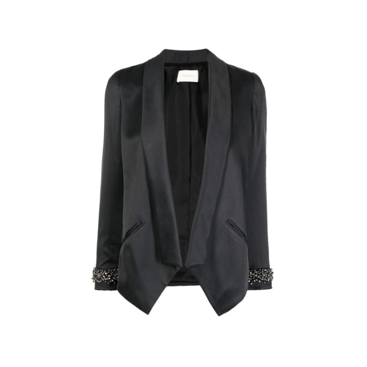 The Dana Embroidered Jacket features a soft and comfortable washed silk fabric with crystal and pearl embroidery at sleeve cuffs.