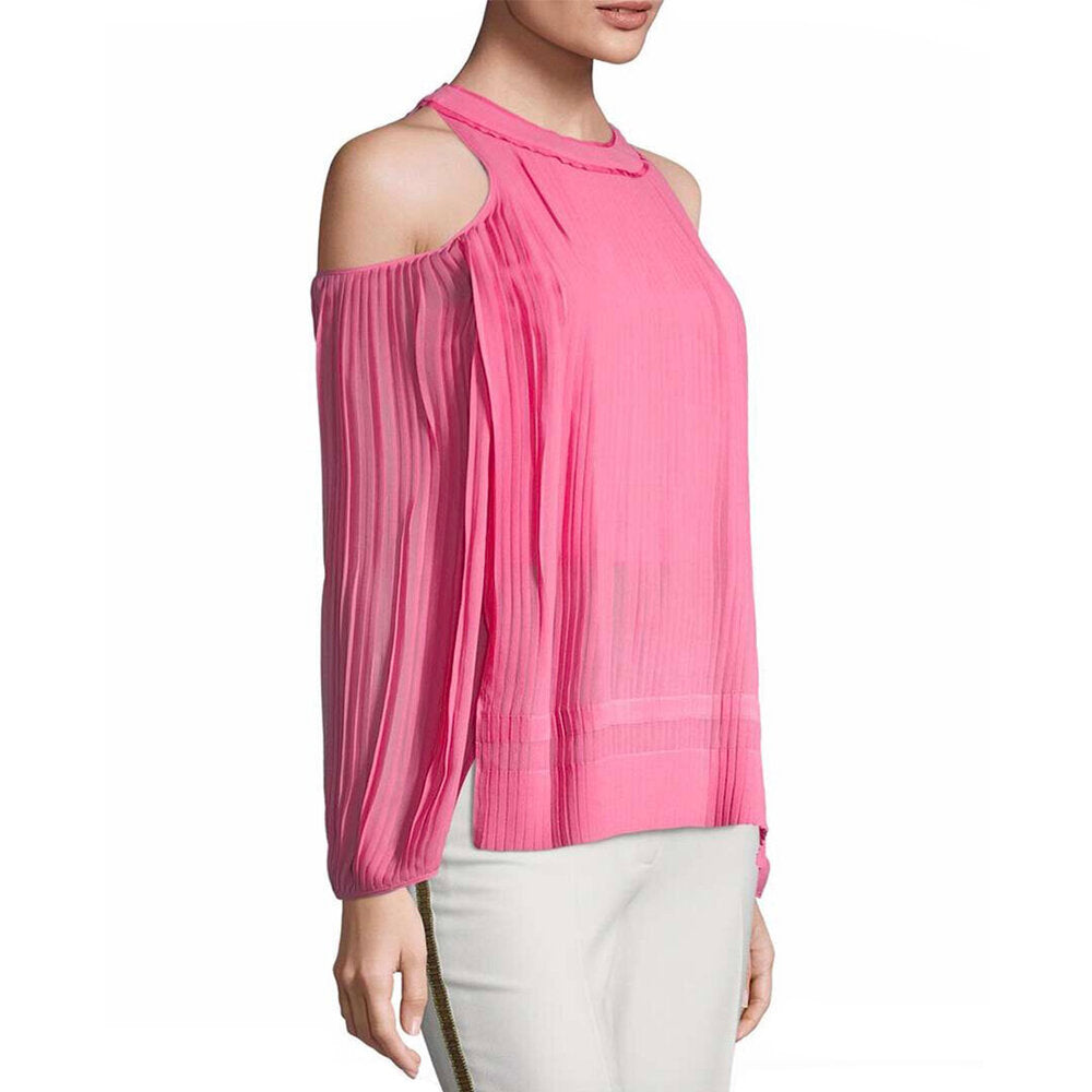 This top features pleated long sleeves with open-shoulders and side slit detail.