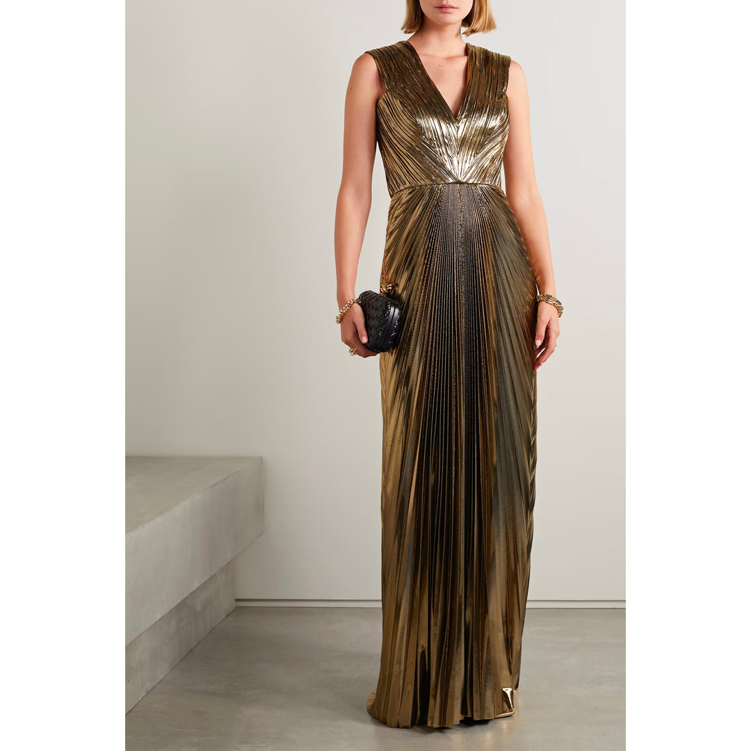 SemSem's gown will ensure all eyes are on you at your next event. Hand-cut from lustrous gold plissé-lamé, it has a plunging V-neckline and cinches at the waist before falling to a maxi hem - notice how all of the pleats are placed to accentuate your shape.